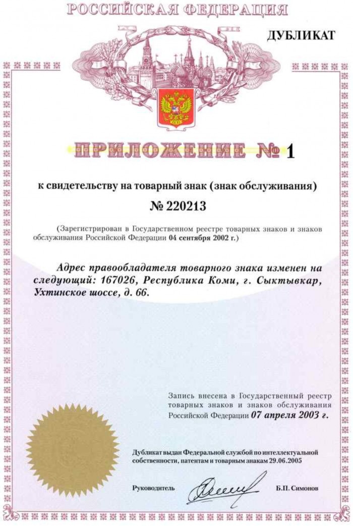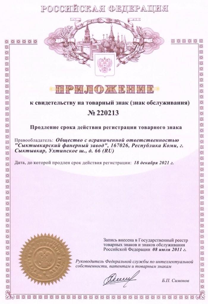 Настоящее свидетельство выдано на товарный знак (знак обслуживания) Обществу с ограниченной ответственностью "Сыктывкарский фанерный завод" в отношении следующих товаров (услуг) – "неметаллические строительные материалы;...". Цветовое сочетание: белый, зеленый. Свидетельство выдано сроком на 10 лет и действует до 18 декабря 2011 г. Дубликат Приложения № 1 свидетельствует об изменении адреса правообладателя товарного знака.