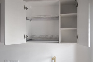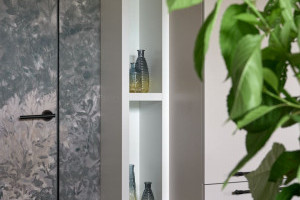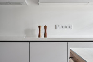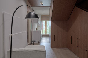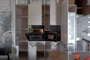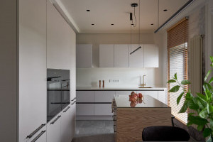 The interior is built on classic design principles, but presented in a fresh and modern way. White walls with carefully placed moldings serve as the backdrop for all the design elements, enhancing the feeling of spaciousness. This light base allowed accents to shine: decorative wall panels add a lively touch, while wood grain finishes lend warmth and texture. The designer strived to maintain a balance in the kitchen-dining room — classic restraint meets vibrant details, creating a dynamic and inviting space.