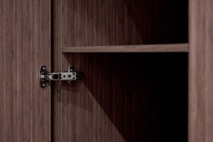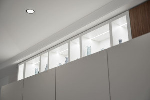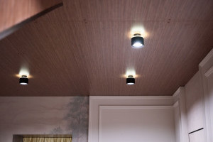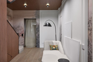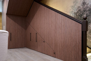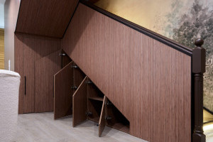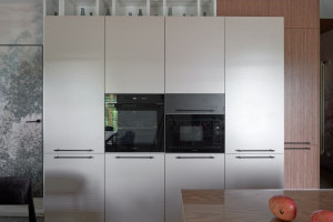 Storage in the kitchen and adjacent stairwell was equally carefully considered. A monolithic composition of Lamarty laminated chipboard in a "Bamboo" decor was created in the stairwell, where the ceiling, built-in storage system, and railing form a single unit. The cabinet fronts blend into the paneling, eliminating visual noise and creating a seamless architectural form for the staircase. The wood decorwith a soft, natural grain complements the overall "forest edge" theme, while integrated lighting between the steps adds a lightness and subtle shimmer — as if sunbeams filtering through the branches.