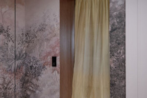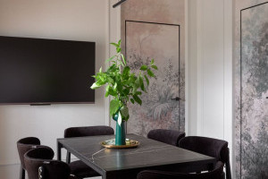 The kitchen-dining room project was conceived as a dialogue between nature and austere classicism. The kitchen and stairwell seem to bring forest vistas to life: dense thickets lead deep into the forest, and a massive black table stands at the light edge of the forest, setting the rhythm of the entire space.