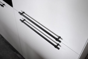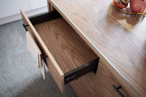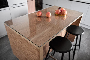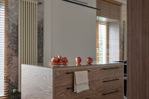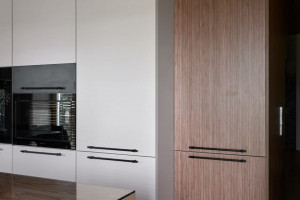 The kitchen continues this idea of unity and spaciousness. The linear section of the kitchen unit is made of Lamarty laminated chipboard with white lamination and black profile handles. The interior is richly furnished: pull-out baskets, tandem drawers, and soft-close storage systems — everything is designed for convenience and ergonomics. A Lamarty laminate island in the "Medea" decor with a distinctive oak veneer pattern has been installed in the center of the kitchen. Its deep amber hue imbues the room with nobility and stability, adding a touch of luxury while remaining cozy and balanced. A glass countertop completes the composition, adding practicality.