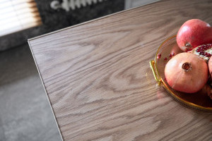 Tall tall cabinets line the wall: one in a wood-like "Bamboo" decor, the others in a soft gray "Teffy" shade. Open shelves above and to the sides complement them, perfect for displaying books, dishes, or favorite decorative items. Vases occupy a shelf, salt and pepper mills occupy the countertop, and the dining table is adorned with golden dishes and a green arrangement. Pomegranates on the island, according to Armenian tradition, promise prosperity and good luck to the home.