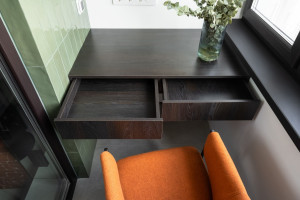 Продолжением кухни стала лоджия, которую дизайнер переосмыслила как компактный кабинет. После утепления и отделки она превратилась в полноценное рабочее пространство — с настенным стеллажом со скруглёнными полками и встроенной диодной подсветкой. Рабочий стол без ножек, но с выкатными ящиками выполнен из тех же плит Lamarty в декоре «Одиссея», благодаря чему лоджия естественно перекликается с кухней, создавая визуальное единство.