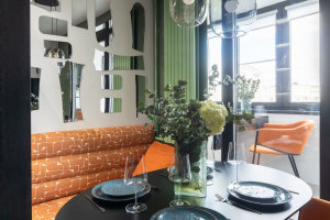 За стеллажами расположилась небольшая, но уютная зона столовой – место, где кухня словно меняет настроение. Мягкий диван в жаккардовой обивке с графичным принтом а-ля 70-е задает тон на расслабление и приглашает задержаться после трапезы. Тёплый свет подсветки отражается в зеркальных элементах на стене, наполняя пространство мягким сиянием. Яркие акценты — стулья оттенка «рыжий пралине» и декор с лёгким винтажным настроением — добавляют живости и тепла, превращая столовую в центр притяжения семьи.