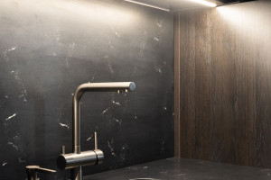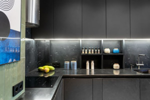 Кухня выполнена в темных графитово-черных тонах, дополненных оливковыми акцентами. Контраст материалов делает интерьер многослойным и выразительным: эмаль фасадов, шпон сланца и текстура древесины создают естественный баланс между строгостью формы и уютом.