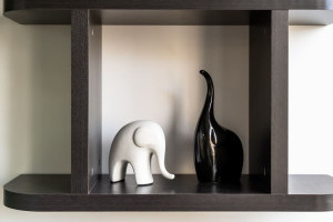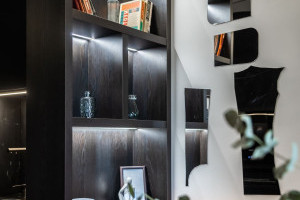 Стеллажи, мягко зонирующие пространство, выполнены из ламинированных древесно-стружечных плит Lamarty в декоре «Одиссея». Их глубокий оттенок натурального тёмного дуба с лёгкими просветами голубой патины добавил интерьеру тепла и благородства, а чёткая текстура материала подчеркнула архитектурный ритм кухни.