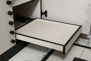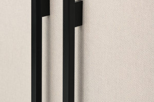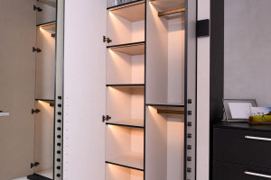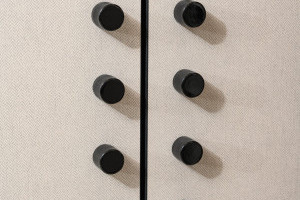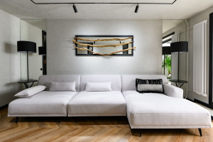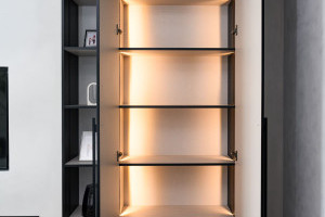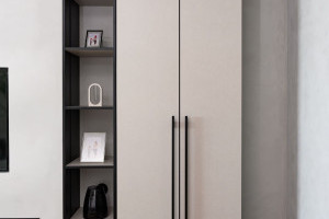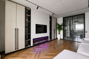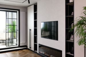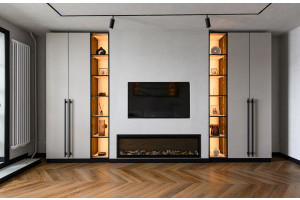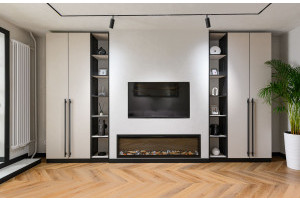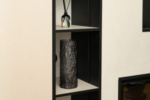 Система хранения стала ключевой архитектурной частью гостиной. Она выполнена из ЛДСП Lamarty с декоративными покрытиями двух оттенков — глубокого «Чёрного» и мягкого «Хюгге». В этой композиции «Хюгге» стал мягким акцентом, который уравновесил строгие линии: фактурная поверхность с тактильным тканевым узором визуально согревает пространство и делает его более живым. Мебельная конструкция встала вдоль стены монолитной композицией из строгих модулей, распределенных по обе стороны каминного короба. Пара открытых стеллажей поддерживает визуальную лёгкость, а закрытые секции обеспечивают ту самую «шахматную» функциональность — продуманную, гибкую, логичную.