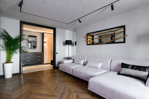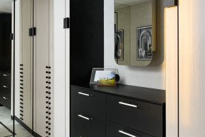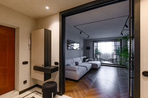 «Ход королевы» стал метафорой в отделке этого интерьера: симметрия, ясные линии, четкие границы и внутренняя собранность, выраженные через архитектурные решения и фактуры. Гостиная преобразилась в графичное и современное пространство, в котором чёрное и белое, глянец и мат, зеркала и мягкие текстуры вступают в тонкий диалог.