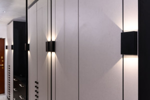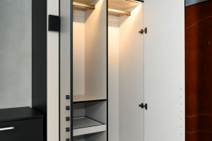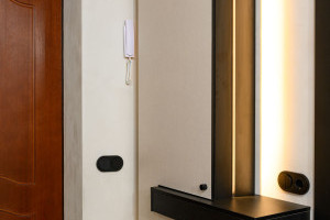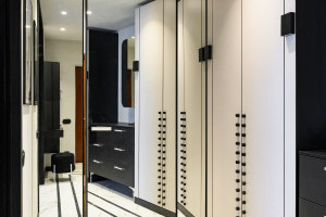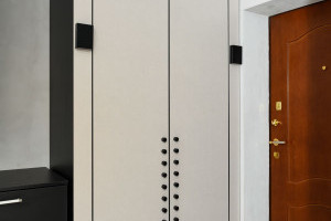 В прихожей материалы мебели вторят гостиной: два симметричных шкафа с фасадами в декоре «Хюгге» выстраивают визуальную ось, поддержанную чёрным комодом на стальных ножках. Декоративные ручки — их понадобилось целых 64 — легли на фасады шкафов, задавая легкую игривость строгому помещению.