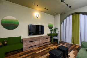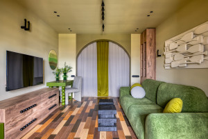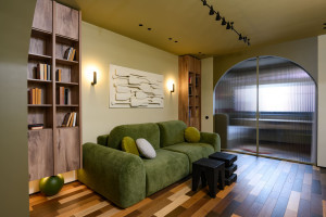Отправной точкой концепции стало особое отношение к окружающему миру: любовь к походам, минералам, дереву, к состоянию, когда не нужно никуда спешить, а можно просто быть — слушать ветер, смотреть на свет, пробивающийся сквозь листву, и накапливать энергию. Эта идея легла в основу всего интерьера и проявилась в цветах, фактурах и образах. Здесь нет прямых цитат природы — вместо них ощущения. Текстуры мха, мягкая неоднородность камня, тени полуденного леса подсказали сложную, но спокойную палитру. Градиентная покраска стен, вдохновлённая многообразием кварца, плавно перетекает от глубоких тёмных оттенков к светлым и почти воздушным, создавая эффект погружения. Потолок и верхние плоскости словно растворяются в зелени мха, середина стен напоминает светлый лишайник, а нижняя часть теплеет желтоватым тоном, как шляпки грибов на лесной поляне.