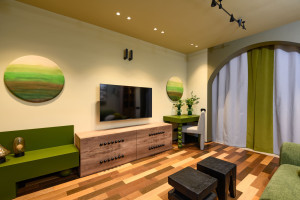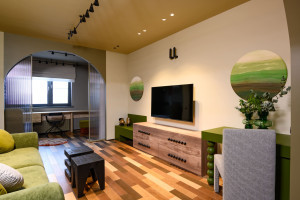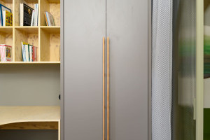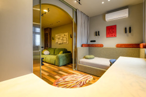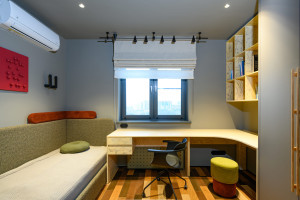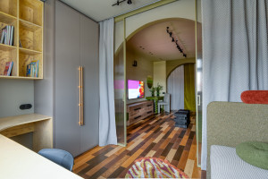 Помещение поделилось по функциональным зонам: большая часть отведена под гостиную с рабочим уголком, а зона у окна огорожена под детскую, которая с помощью раздвижных перегородок может менять сценарии и становиться частью гостиной или уединенным уголком.