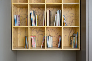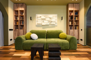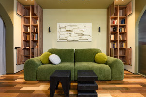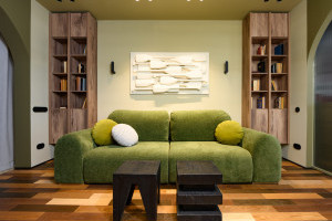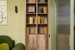 Отделка и предметы интерьера работают как единое целое. Пол из инженерной доски разных оттенков напоминает срез горной породы — немного случайный, живой, лишённый излишней аккуратности. Мебель поддерживает архитектуру помещения. Высокие библиотечные шкафы с массивными торцами напоминают стволы деревьев. Их спокойная, но выразительная древесная текстура в декоре «Соул» из коллекции ЛДСП Lamarty визуально согревает интерьер, оставаясь мягким фоном для книг, предметов и личных коллекций. Конструкция устремляется в потолок, балансируя на шарообразных опорах, создавая иллюзию движения и лёгкости. Строгий каркас с массивными выступающими торцами подчеркивает современность мебельной композиции.