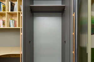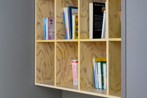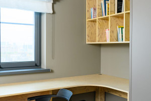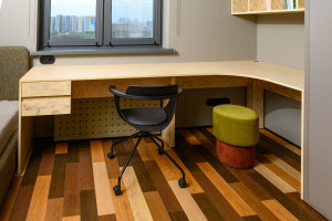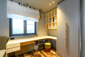 В детской зоне это ощущение природы переосмысляется более камерно и графично. Здесь появляется эффектный рабочий стол из березовой фанеры высоких сортов SyPly Birch Top — предмет с характером и настроением. Чтобы добиться выразительной, почти художественной фактуры, фанеру подвергли целому ряду декораторских приёмов: верхний слой выборочно выжигали, шлифовали, затем тонировали. В результате материал приобрёл сложную, живую поверхность, а сам стол стал не просто функциональным элементом, а частью интерьерной композиции, добавляя пространству лёгкую театральность и ощущение ручной работы. Для хранения в детской зоне предусмотрен шкаф из ЛДСП Lamarty в декоре «Клауд». Его нейтральная база с серым подтоном не перегружает интерьер, создавая комфортный фон для жизни ребёнка и поддерживая общую интонацию проекта.
