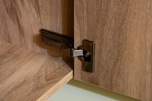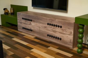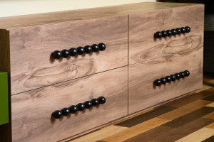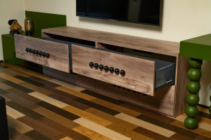 Комод под телевизор, выполненный из ЛДСП Lamarty в том же древесном декоре «Соул», отвечает за повседневный функционал и хранение, а его тёплая, живая текстура поддерживает природную палитру интерьера. Фасады комода украшены ручками-бусинами, которые добавляют интерьеру легкой игривости. Мебельные плиты Lamarty здесь работают как пластичный инструмент, который позволяет выдержать единую стилистику, сохранить тактильность и при этом обеспечить прочность и удобство в повседневной жизни.