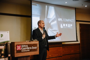 Региональный представитель фабрики столешниц «Кедр» Инна Долгих и руководитель направления HPL Compact Максим Ломов познакомили участников с новыми разработками компании. Представленные решения демонстрируют гармоничное сочетание прочности, практичности и современной эстетики.