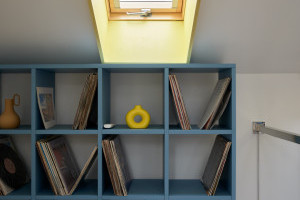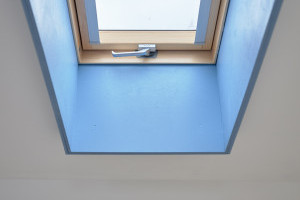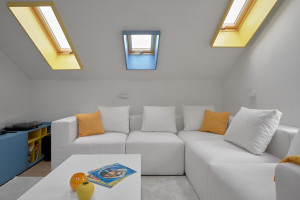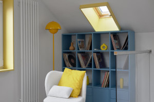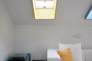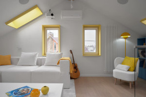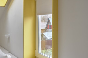 Одной из таких деталей стала отделка откосов мансардных окон. Здесь использована березовая фанера SyPly BIRCH Top сорта E/BB, которая органично встроилась в общую концепцию. Фанерные откосы выкрашены в яркие оттенки. Цветовые решения — солнечно-желтый и небесно-голубой — поддерживают идею света и неба, превращая оконные проемы в самостоятельные декоративные элементы. При этом материал выбран не случайно: влагостойкая березовая фанера отличается прочностью и устойчивостью к условиям эксплуатации, а высший сорт с отсутствием дефектов древесины идеально подходит для окрашивания поверхности.