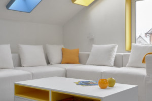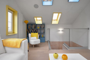 Скаты кровли превратились в выразительную плоскость, где появились мансардные окна разных размеров, расположенные в почти случайном, живом ритме. Такое решение позволило буквально «впустить небо» внутрь, сделать свет подвижным и меняющимся в течение дня. Чтобы поддержать эту игру, в интерьер аккуратно добавили цвет — не в крупных плоскостях, а в деталях, которые работают как акценты и не перегружают пространство.