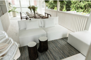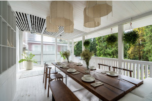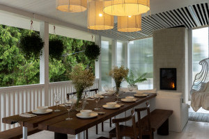 Обновленная веранда выполнена в едином стиле, где каждый элемент лаконично дополняет и перекликается друг с другом. Пространство поделено на три зоны, которые хоть и несут разную смысловую нагрузку, но при этом очень гармонично вписываются в общую концепцию.