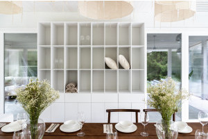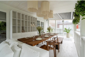 В центре веранды обосновалась столовая с большим обеденным столом из слэбов горного тополя, за которым теперь с легкостью разместятся все гости. Необычное, но при этом органичное соседство изящных стульев и массивных лавок позволит каждому найти себе место по душе. Оригинальные светильники над обеденной зоной будут создавать тёплую домашнюю атмосферу. Функциональным дополнением столовой зоны стал шкаф, в котором можно будет хранить вещи необходимые для посиделок на веранде: пледы, подушки, посуду. Внушительный стеллаж был выполнен по эскизам автора проекта из березовой фанеры повышенной прочности со специальным покрытием под покраску – SyPly PRIMER. Материал облицован специальной защитной бумагой, позволяющей окрашивать изделия сразу без дополнительной подготовки поверхности. Влагостойкий материал подходит в том числе и для улицы, так что опасаться за сохранность мебели не придётся.