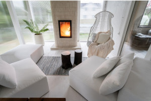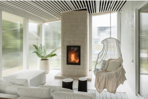 Теплую и уютную зону отдыха выстроили в глубине веранды, центром которой стал очаг. Портал камина со сглаженными углами собрали из кирпича и облицевали керамогранитом. Очаг закрыли контрастной металлической дверцей черного цвета с большим видовым окном для любования пламенем. В зоне отдыха можно комфортно расположиться на большом удобном диване, который при желании превращается в отдельные кресла. Компанию мягкой мебели составило кресло-качель.
