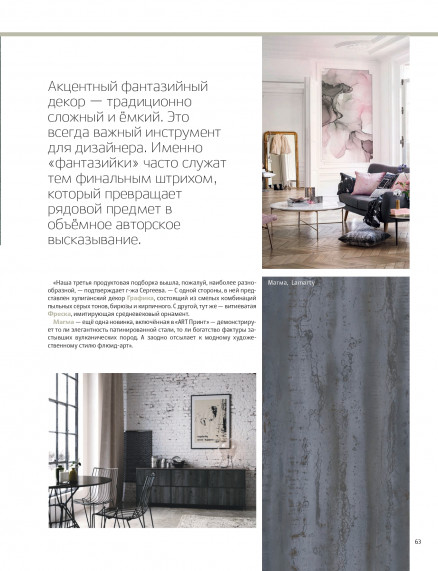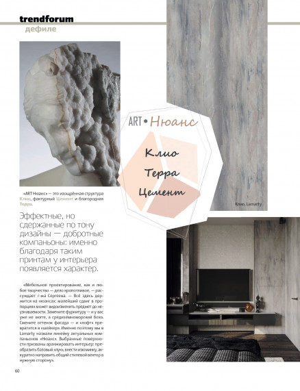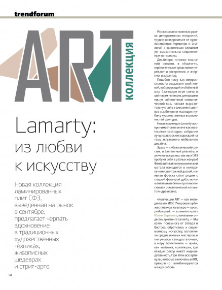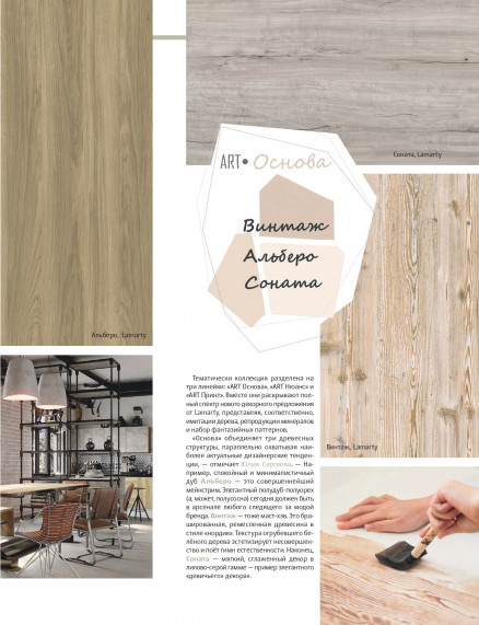 Тематически линейка разделена на три линейки: «ART Основа», «ART Нюанс» и «ART Принт». Вместе они раскрывают полный спектр нового декорного предложения от Lamarty, представляя, соответственно имитации дерева, репродукции минералов и набор фантазийных паттернов.