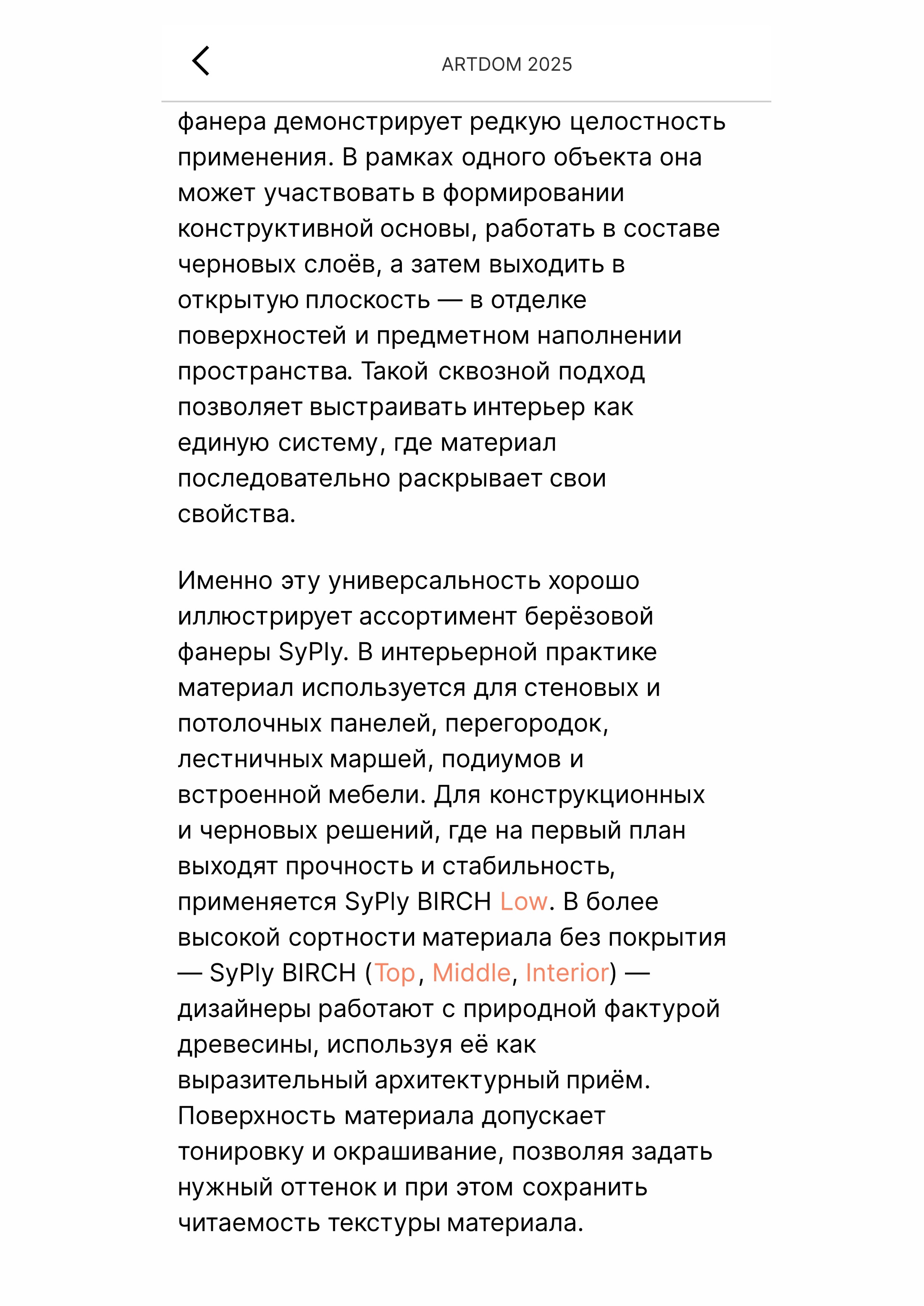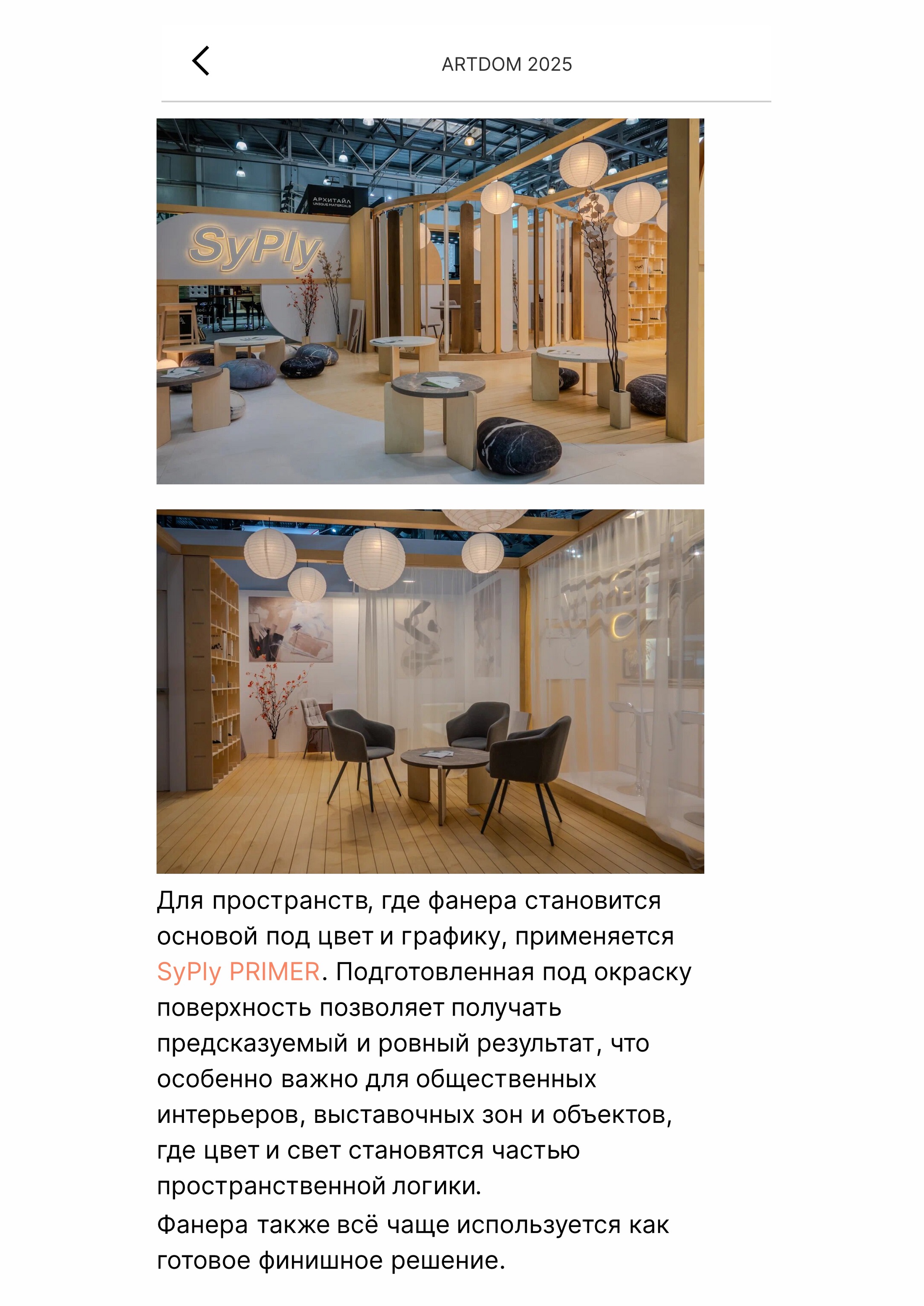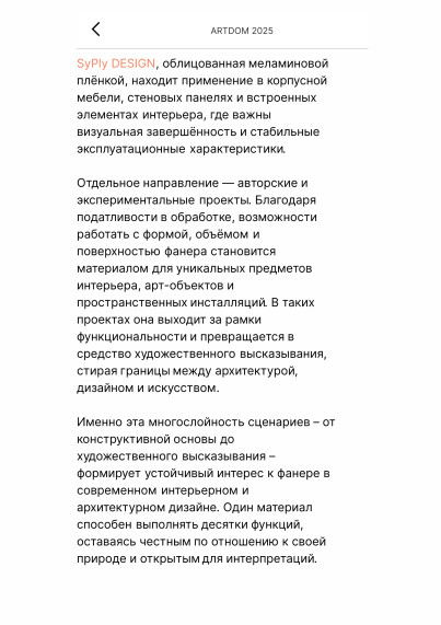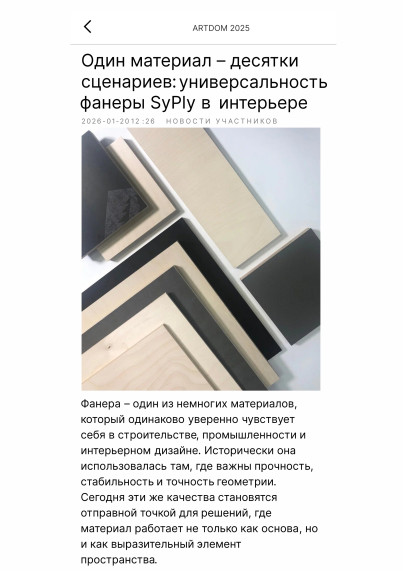 Ассортимент берёзовой фанеры SyPly иллюстрирует этот подход на практике: разные сортности и форматы материала применяются в стеновых и потолочных панелях, перегородках, мебели, лестницах и подиумах, а также в общественных и выставочных пространствах. Отдельное направление — авторские и экспериментальные проекты, где фанера становится инструментом работы с формой, объёмом и художественным образом.