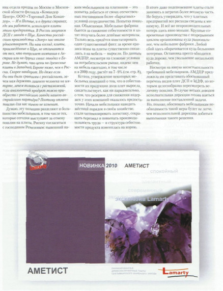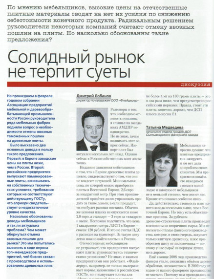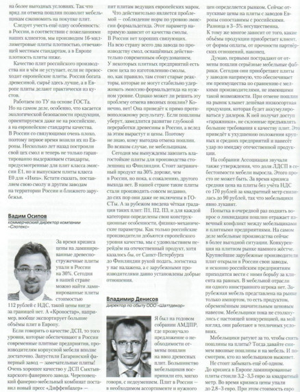 На прошедшем в феврале годовом собрании Ассоциации предприятий мебельной и деревообрабатывающей промышленности России руководители ряда мебельных фабрик подняли вопрос о необходимости отмены ввозных таможенных пошлин на древесные плиты. Было высказано два основных довода в пользу такого предложения. Первый: в Европе заводские цены на плиты ниже, чем в России. Второй: российские предприятия выпускают ламинированные плиты, основываясь на собственных технических условиях,требования которых не соответствуют действующему ГОСТу, что априори свидетельствует о недостаточном уровне качества.