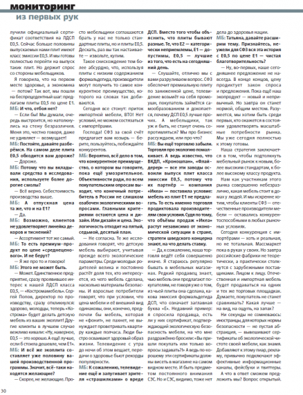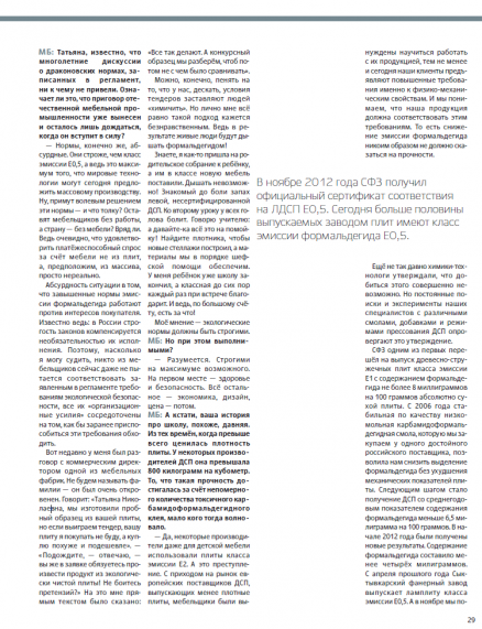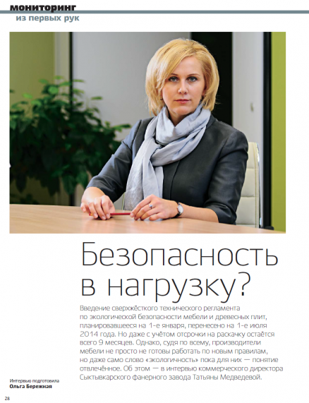 Введение сверхжёсткого технического регламента по экологической безопасности мебели и древесных плит, планировавшееся на 1-е января, перенесено на 1-е июля 2014 года. Но даже с учётом отсрочки на раскачку остаётся всего 9 месяцев. Однако, судя по всему, производители мебели не просто не готовы работать по новым правилам, но даже само слово «экологичность» пока для них — понятие отвлечённое. Об этом — в интервью коммерческого директора Сыктывкарского фанерного завода Татьяны Медведевой.