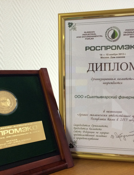 Сыктывкарский фанерный завод - единственный из всех деревообрабатывающих предприятий страны - награжден в номинации «Лучшее экологически ответственное предприятие региона в 2013 году» Почётным дипломом и Золотой медалью Российского промышленно-экологического форума «РосПромЭко-2013». Форум проходил в Москве в ноябре 2013 года.